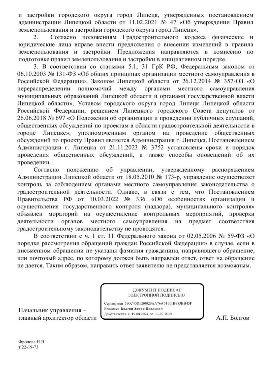 Депутат Липецкого областного Совета от ЛДПР продолжает переписку по поводу застройки района Карьера с региональным управлением архитектуры и строительства